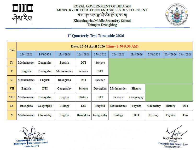 Khasadrapchu Middle Secondary School follow a structured system for conducting tests and examinations to ensure fair and continuous assessment of students’ learning. This system includes both formative and summative assessments, allowing teachers to monitor progress throughout the academic year. Class tests, assignments, and project work are regularly conducted to evaluate students’ understanding and provide timely feedback for improvement. At the end of each term, schools administer standardized examinations under strict guidelines to maintain transparency and credibility. The marking process is carefully moderated, and results are shared with students and parents to promote accountability. In recent years, Bhutanese education has also emphasized competency-based assessment, focusing not only on memorization but also on critical thinking and practical skills. Overall, the examination system in Bhutanese schools plays a vital role in maintaining academic standards, guiding teaching practices, and supporting students in achieving holistic development.